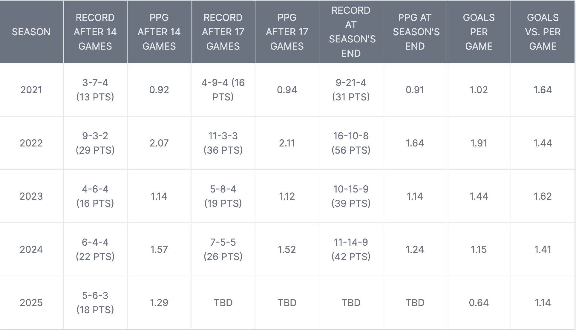 It's table-making time! I did this to illustrate better where the team currently stands compared to past seasons. Records are displayed in the American wins-losses-draws format.