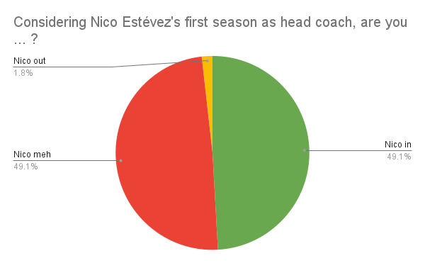 Less than 2% want him out, with the rest split eerily evenly between good and meh. If we do this again next year, I'll be very interested to see how this shifts based on whether Verde can do better than 6th.