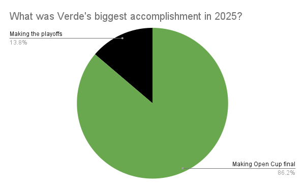 More than three in four called 2025 a success, and less than five percent said no. The nearly 18% who said "still unsure" were actually answering "still unsure, depending on the playoffs," with the survey starting before the playoffs did, so given the first-round exit in two games, that can't really help. And yet, Verde did perform well enough in the first match against LAFC to win, and perhaps that was better than expected for some.