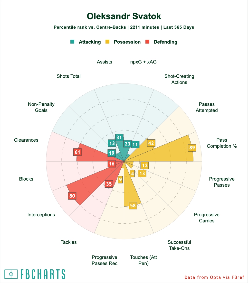 Those are absurdly good numbers in three of four defensive categories, and he also does a decent amount of chance creation. (Looking deeper into the stats, he's also in the 91st percentile for the very specific category of goal-creating actions by drawing fouls, which I just find amusing.)