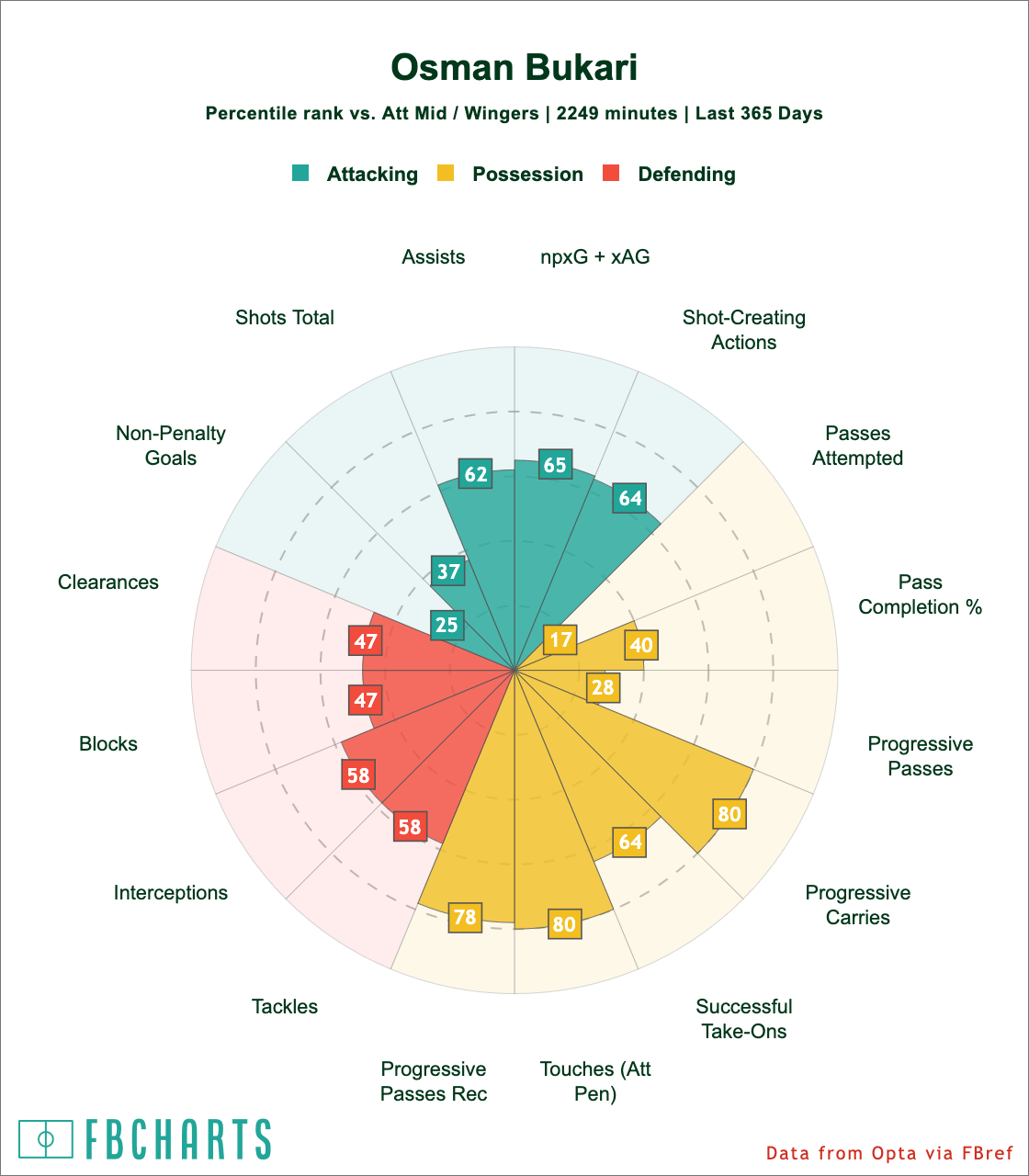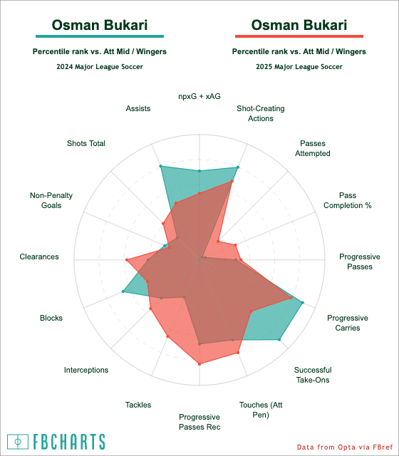 Again, while it's limited minutes in 2024, there's a bit more defensive work in his game reflected and a little more shooting, but a little down on three of the stats that you're like to see Bukari excel in as an ostensibly playmaking winger: shot-creating actions, assists, and non-penalty expected goals plus expected assisted goals (npxG+xAG).