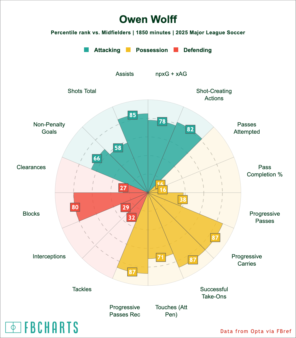 So, Wolff's not a 10, but he's doing some 10-adjacent things well. He's good at moving the ball forward, both dribbling and passing, and moving the ball against defenders. He's in an appreciably good place with assists and shot-creating actions.