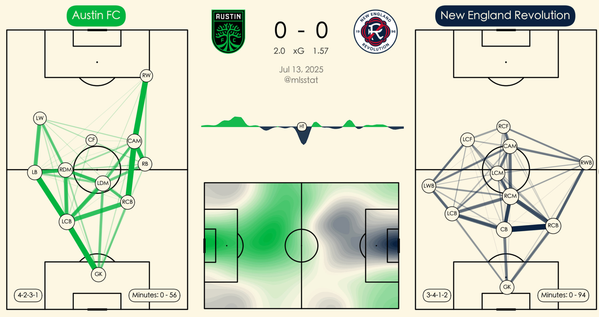 Given that the thickness of the line indicates how much passing is happening between the players, the relatively light involvement of Myrto Uzuni (CF in the graphic) remains a concern. It's fine having pushed-up wingers like this as long as they're cutting passes back in to the striker — and as we've noted prior, the 16th-minute square pass resulting in Uzuni's best chance of the night should have been enough, but sometimes desperation kick saves just happen.