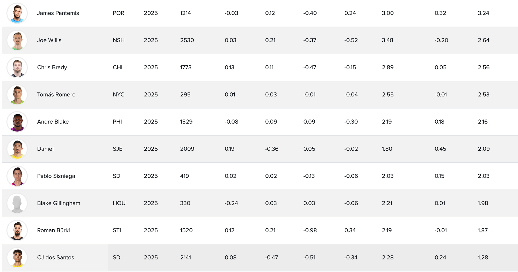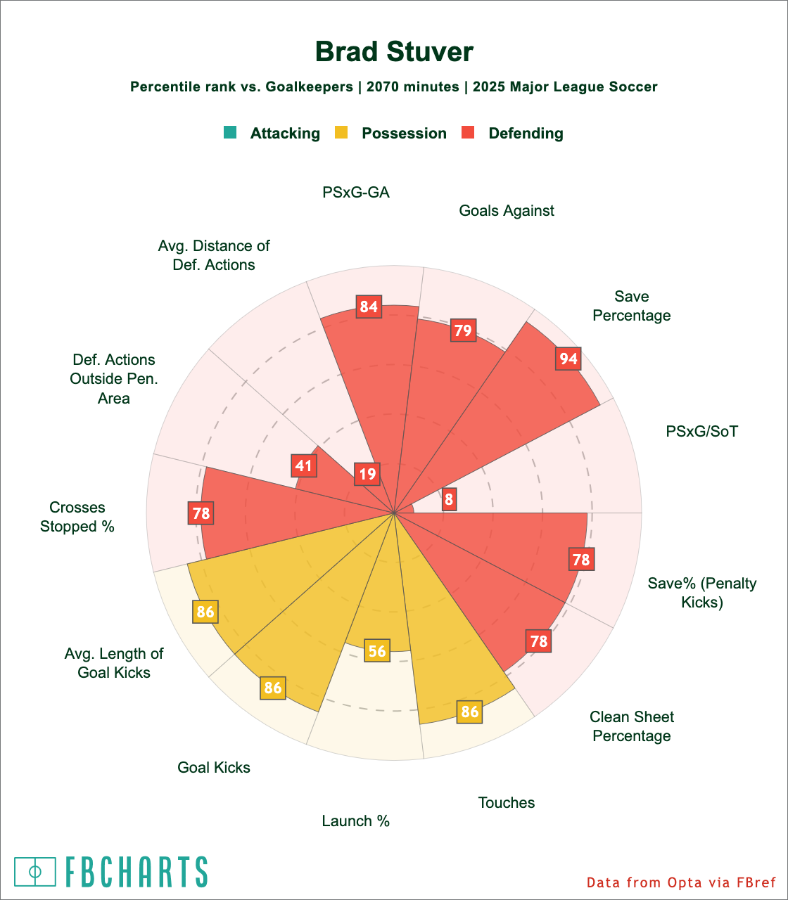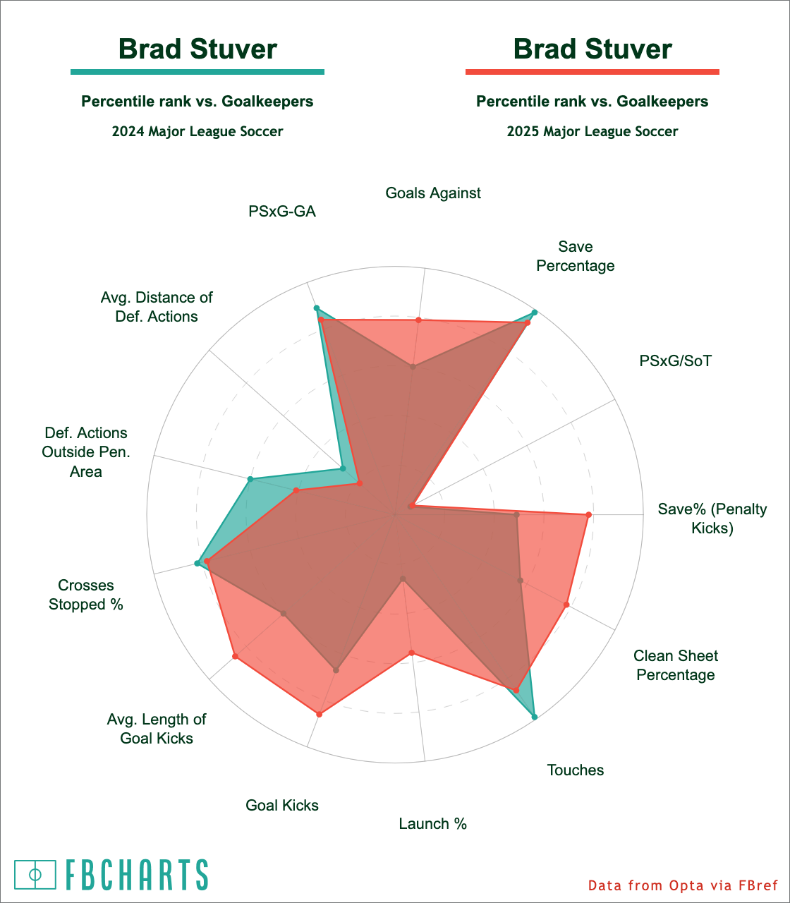 Weirdly, FBref doesn't like Stuver's per-shot totals compared to other goalkeepers so far in 2025, but likes everything else about his game.