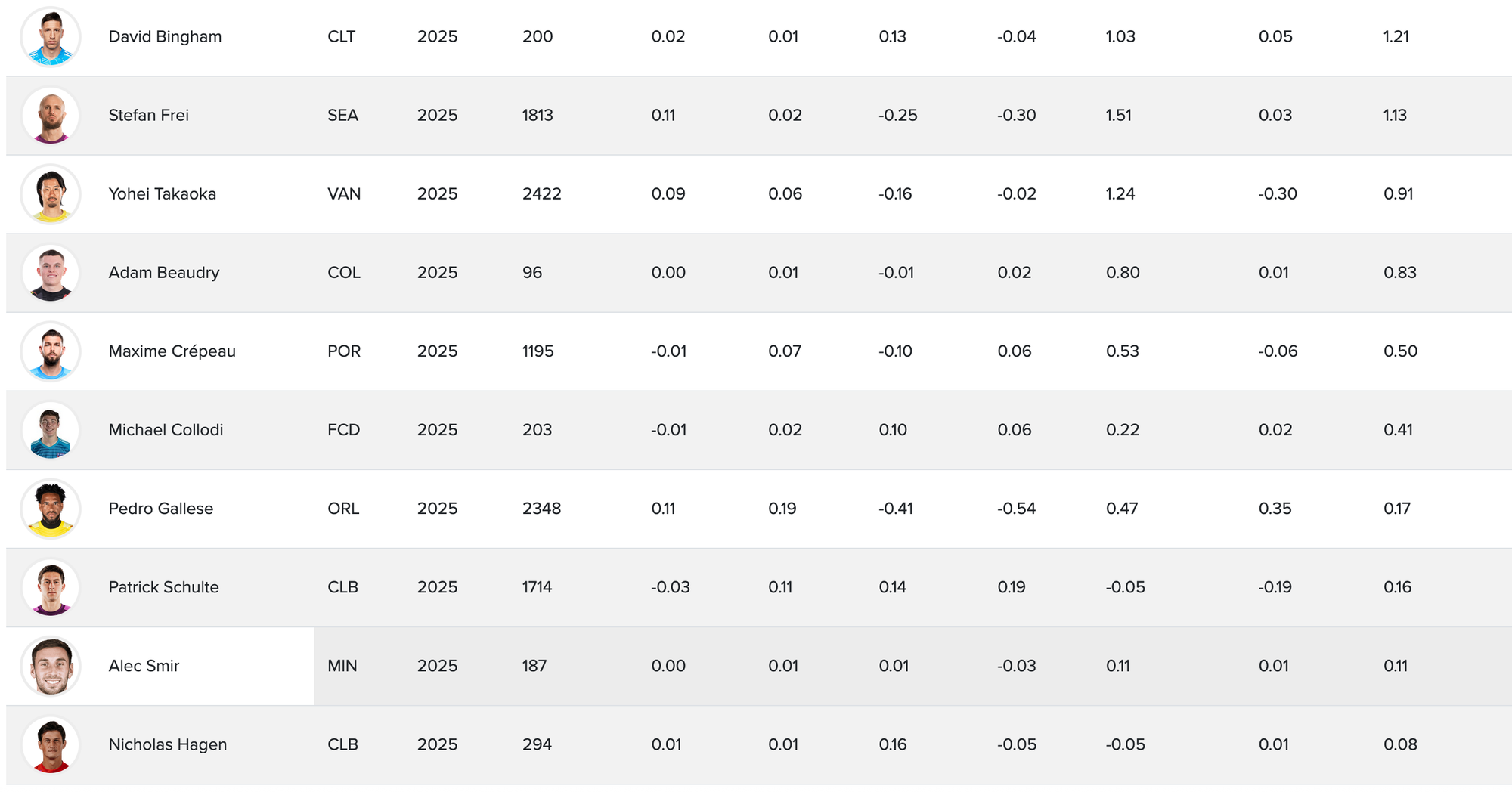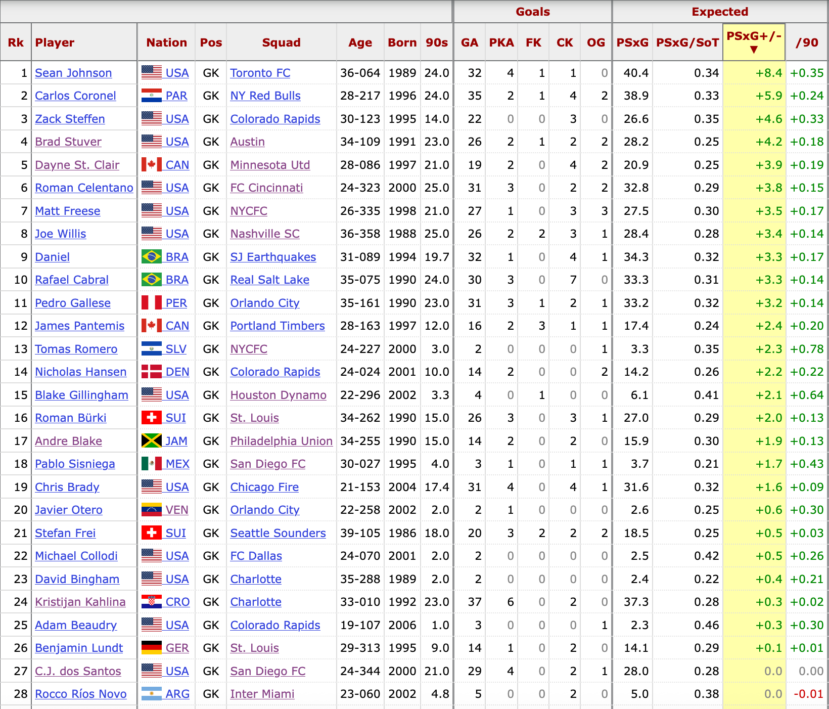 Beyond there, you have some surprises, including Sounders mainstay Stefan Frei and Whitecaps All-Star and Crossbar Challenge hero Yohei Takoaka slightly below Charlotte journeyman David Bingham (on his fourth MLS club since 2017) and slightly ahead of Portland's Maxime Crépeau (who lost the starting job to Jimmy Pants earlier in the season) and Orlando's Pedro Gallese.