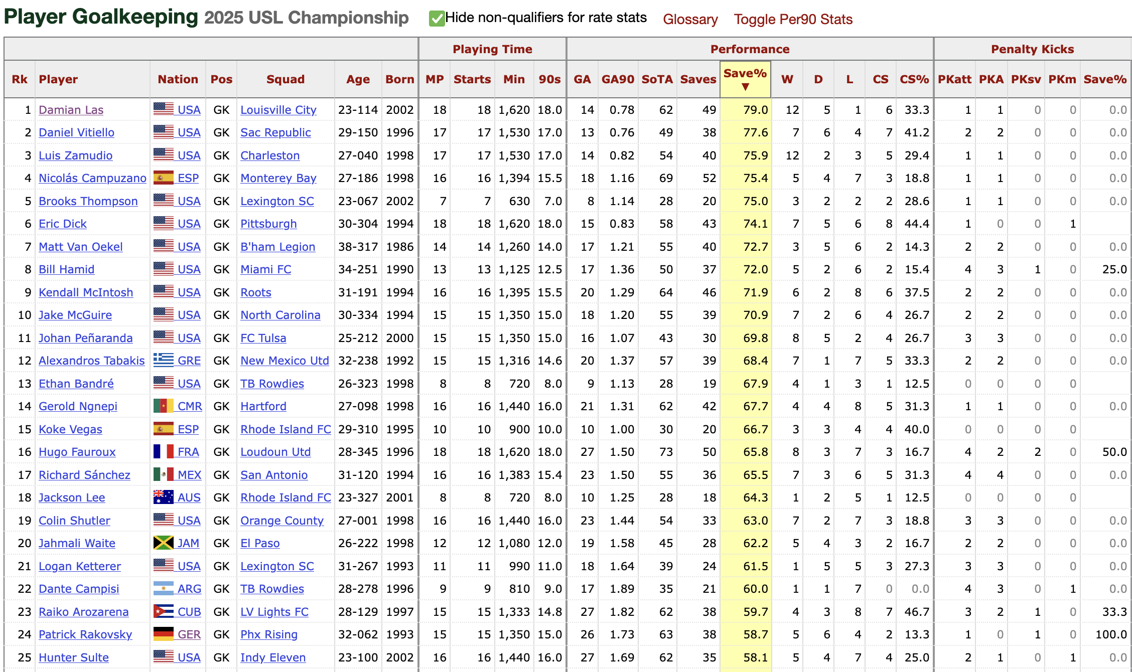 The random tidbit that jumps out to me on this list: Las has a better save percentage than Bill Hamid, a USMNT-capped goalkeeper who won MLS Goalkeeper of the Year in 2014 when playing with D.C. United (and who now finds himself with Miami FC).