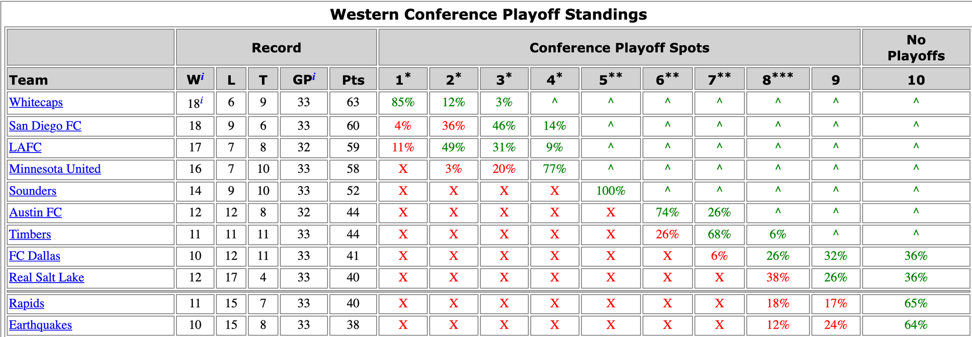 A look at playoff odds (green means team controls its own destiny for getting to that place, and red means it does not)
