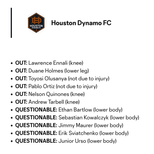 The questionable list includes, in Sviatchenko and Kowalcyzk, two key starters, and Bartlow's been a solid defensive piece for the Dynamo, drafted 6th in the 2021 MLS SuperDraft that brought Dani Pereira and Freddy Kleemann to Austin.