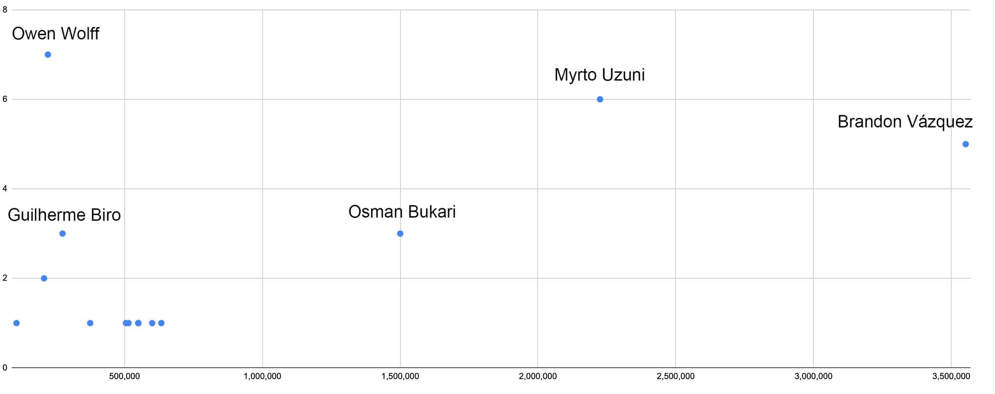 Looking at the goals-to-salary numbers, here's what it looks like on a scatter plot chart.
