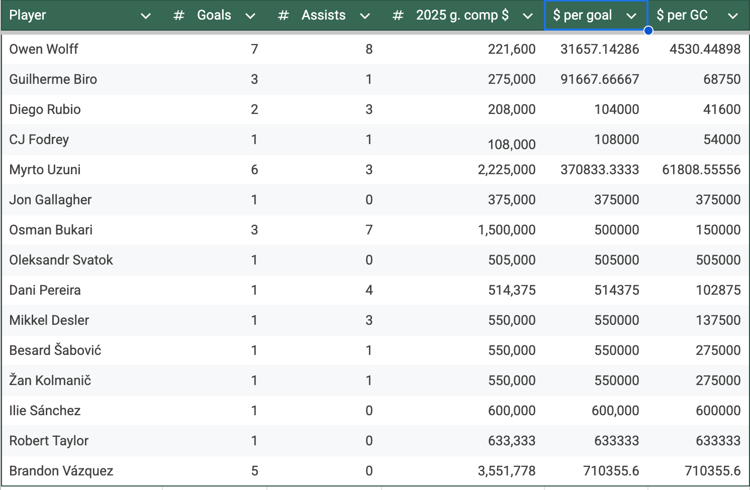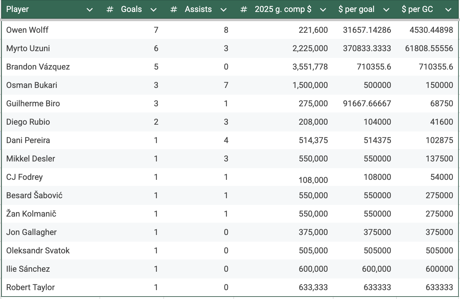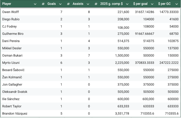 Denis Bouanga's 24 goals are a little more per goal, with the $3,709,500 LAFC is paying him in 2025, but that's just $154,562.50 per goal, and when you consider his nine assists, that's $112,409 a goal contribution.