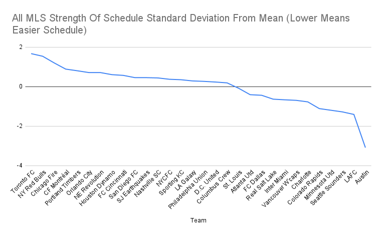 See how that falls off a cliff when it gets to Austin? And look at St. Louis at the mean, and how more than half the MLS teams are above the mean in their remaining games.