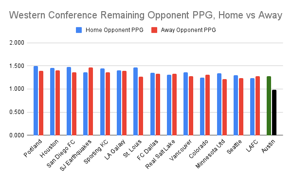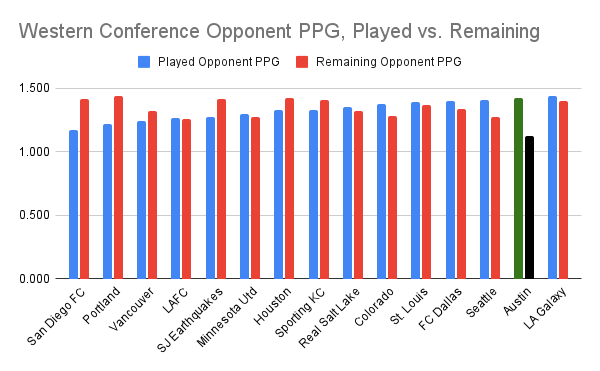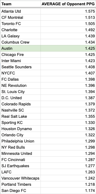 I'd initially run some numbers to attempt a strength-of-schedule calculation, using points per game as the metric. I found that if you took Austin FC's first nineteen opponents – that includes counting Vancouver, San Diego, Minnesota, and Portland twice, as Austin's played each of those teams home and away already — added all opponents' current points per game (starting with adding 2.06 to 2.06 to get Vancouver's lofty contribution), and divided the total by 19, Verde's opponents have an average 1.425 PPG in that half-plus-two-games so far this season.