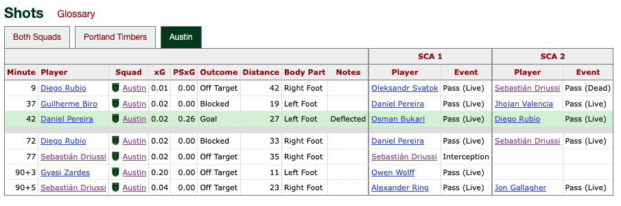That shot represented 0.2 xG of the 0.33 xG Verde earned on the night. Again, the visitors won 1-0, mustering only seven shots to the Timbers’ 26. FBref credited the Timbers with 10 shots (MLS counted 11); Brad Stuver saved all of them. The Timbers’ Maxime Crepeau faced a single shot on target and let that in. As the maxim goes (or, maybe here, how the Maxime goes), sometimes it’s better to be lucky than good.
